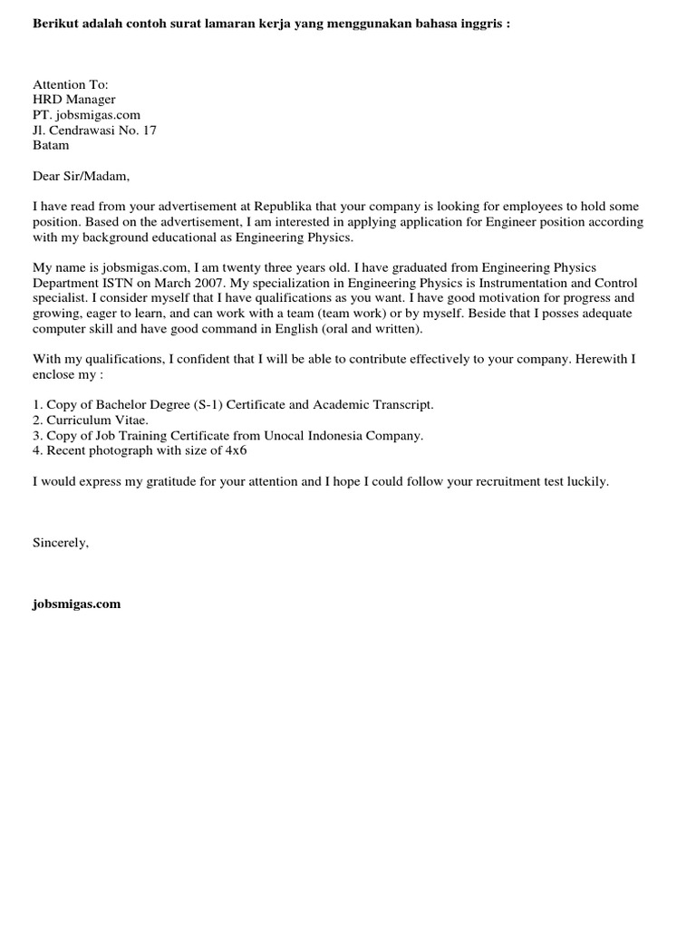 Saat melamar pekerjaan dokument yang paling wajib di cantumkan iyalah surat lamaran pekerjaan. Ulasan ini berisi contoh surat lamaran kerja yang benar, termasuk contoh lamaran kerja bahasa inggris. I have graduated from mechanical engineering of the state polytechnic of sriwijaya at palembang on september 2011. Tetapi terdapat sejumlah kesalahan fatal yang tidak disadari oleh para pelamar khususnya, sehingga membuat kesempatan.
